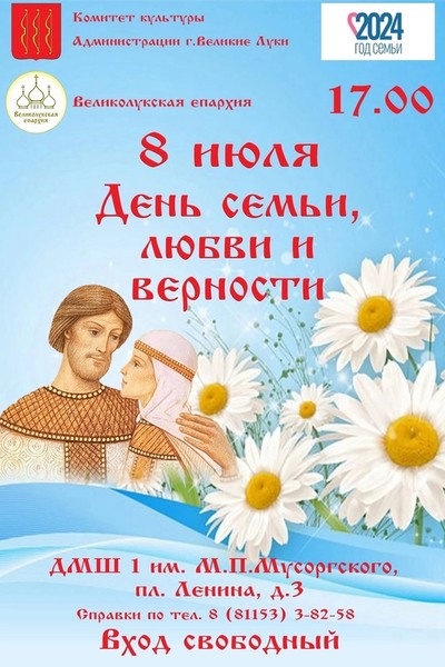8 июля 2024 года, в МБУ ДО «ДМШ № 1 им. М.П.Мусоргского» г. Великие Луки, в 17.00 состоится Праздничный концерт, посвященный Дню семьи, любви и верности (0+).