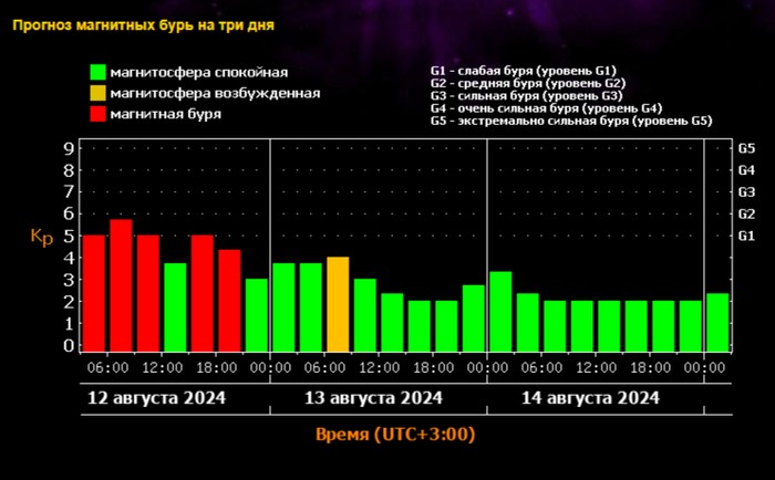 По обновлённым прогнозам, магнитная буря продлится практически до конца сегодняшнего дня, а её интенсивность будет меняться в диапазоне от средней до слабой. Во вторник ещё сохранятся отдельные периоды слабых возмущений геомагнитного поля, а в среду магнитосфера Земли вернётся в спокойное состояние, сообщает метеоцентр Фобос.