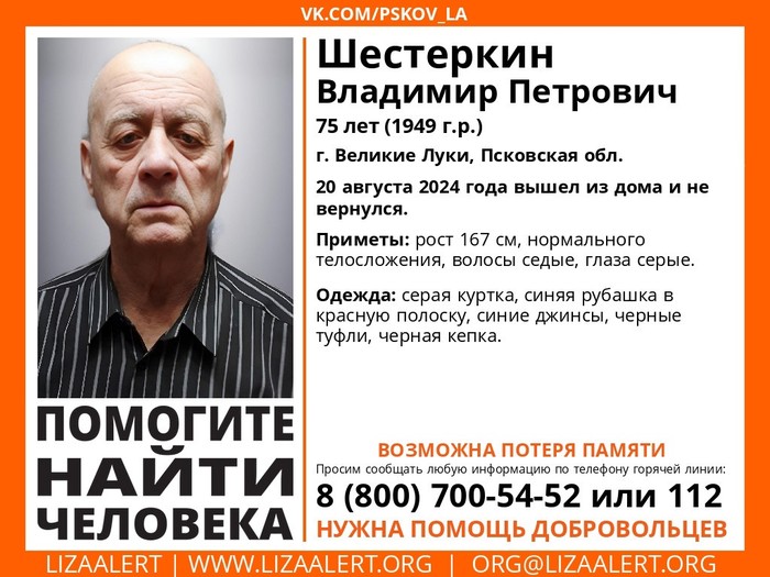 В Великих Луках разыскивают Шестеркина Владимира Петровича, 1949 г.р. 20 августа он ушел из дома и не вернулся. Об этом сообщается в группе поисково-спасательного отряда «ЛизаАлерт» Псковской области.