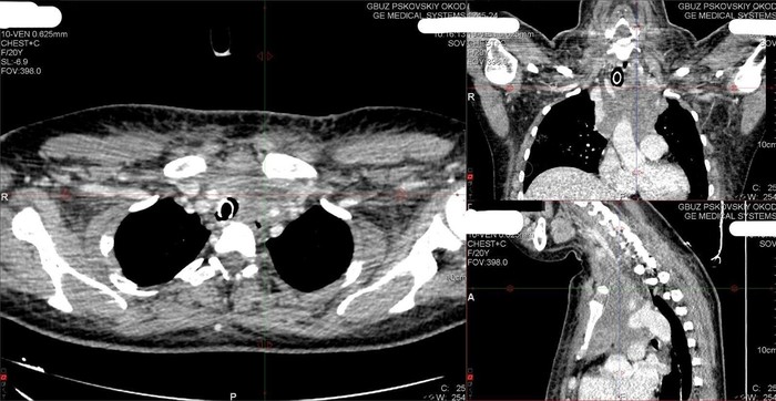 В Псковский областной клинический онкологический диспансер обратилась 21-летняя пациентка в тяжёлом состоянии с жалобами на затрудненное дыхание и одутловатость лица. Причиной стало опухолевое поражение лимфоузлов средостения, которые, превратившись в большой конгломерат с кулак, сдавили трахею пациентки и верхнюю полую вену – очень важный крупный сосуд в грудной клетке. Об этом Интернет-порталу ВЛуки.ру рассказали в пресс-службе Комитета по здравоохранению Псковской области.