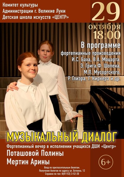 29 октября в 18:00 в концертном зале Детской школы искусств «Центр» пройдет фортепианный вечер «Музыкальный диалог»(6+), в котором примут участие учащиеся Полина Поташова и Арина Мертин.