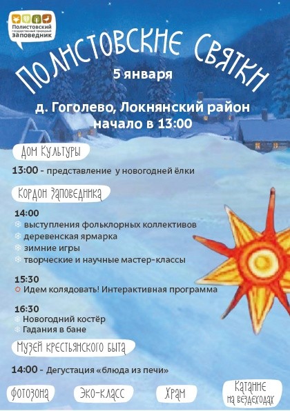 5 января в деревне Гоголево Локнянского района пройдет фольклорный праздник «Полистовские Святки» (6+), сообщили в Полистовском заповеднике.