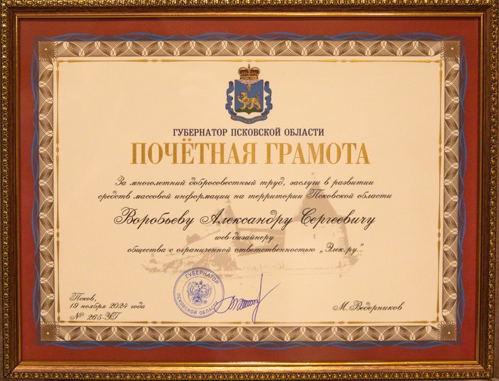 Губернатор Псковской области Михаил Ведерников в День российской печати вручил Почётную грамоту за многолетний добросовестный труд и заслуги в развитии средств массовой информации на территории Псковской области известному великолукскому фотографу Александру Воробьёву.