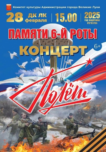 28 февраля в 15:00 в Доме культуры Ленинского Комсомола состоится концерт «Полёт» (6+), посвящённый 25-летию подвига десантников 6 парашютно-десантной роты 104 гвардейского парашютно-десантного полка 76 гвардейской воздушно-десантной дивизии.