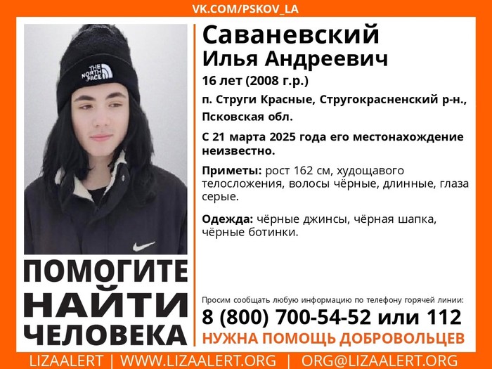 В Псковской области разыскивается Саваневский Илья Андреевич, 2008 г.р. С 21 марта его местонахождение неизвестно. Об этом сообщается в группе поисково-спасательного отряда «ЛизаАлерт» Псковской области.