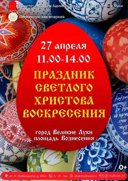 27 апреля с 11.00 до 14.00 на площади Вознесения города Великие Луки, пройдет культурно-просветительское мероприятие, посвященное празднику Светлого Христово Воскресения (0+).