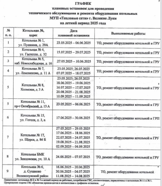 Администрация города Великие Луки информирует жителей о временных изменениях в графике плановых остановок котельных МУП «Тепловые сети» на летний период 2025 года.