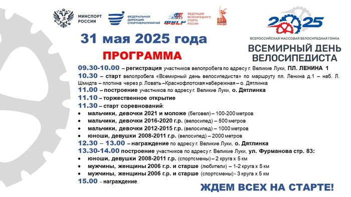 31 мая в городе Великие Луки пройдет IV Всероссийская массовая велосипедная гонка «Всемирный день велосипедиста», сообщили в Центре подготовки велосипедистов (0+).