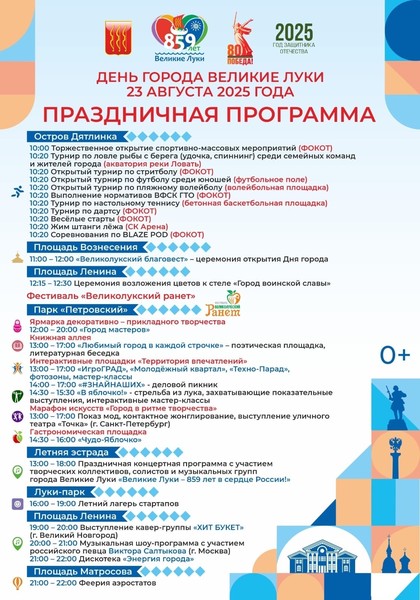 - 13:00–18:00 – Концерт «Великие Луки – 859 лет в сердце России!»