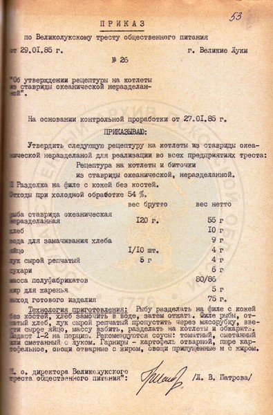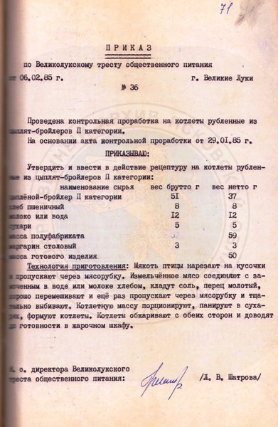 Перед вами фрагмент рецепта приготовления котлет, который был утвержден Великолукским трестом общественного питания в 1985 году, сообщили в Государственном архиве Псковской области.