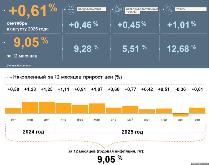 В сентябре цены в Псковской области выросли на 0,61 % к августу, следует из данных Росстата. Кроме того, годовая инфляция ускорилась и составила 9,05 %, превысив показатель в целом по стране, который составил 7,98 %.